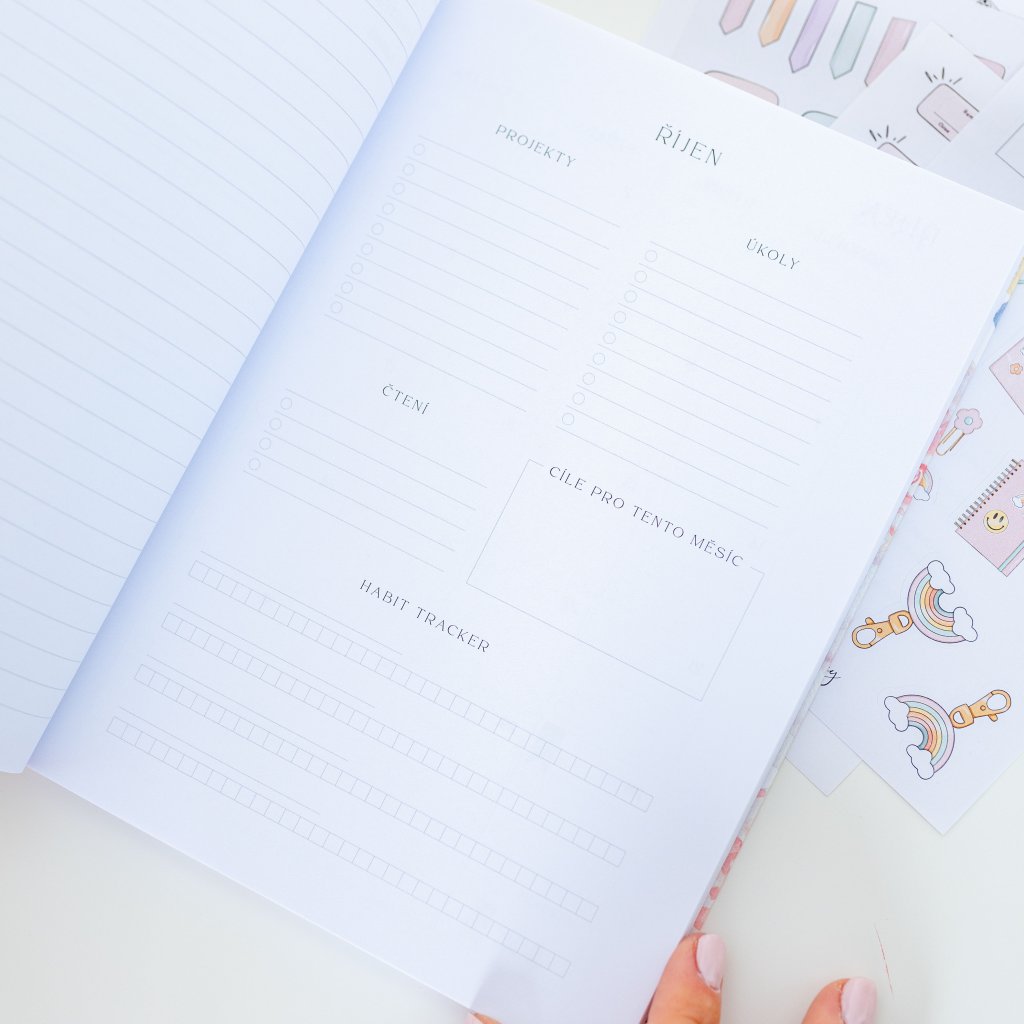 Na začátku každého měsíce je speciální stránka na projekty, úkoly, materiály k přečtení, měsíční cíle a habit tracker, který pomůže sledovat vaše návyky.