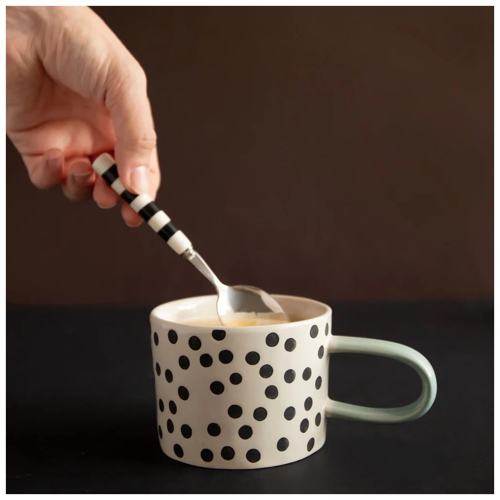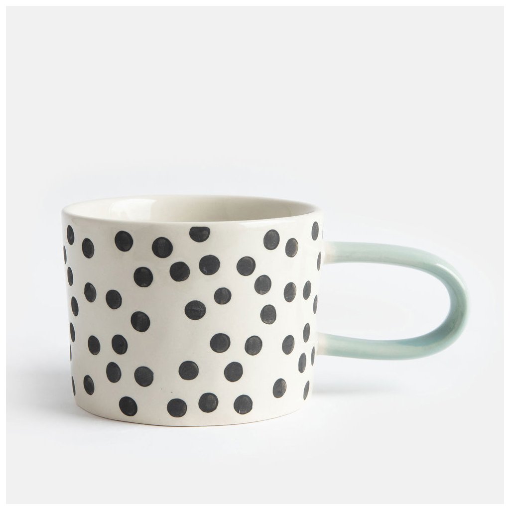 Ručně malovaný hrnek z glazované kameniny s prodlouženým uchem. Vhodný do myčky nádobí. Upozorňujeme, že tyto výrobky jsou ručně malované a ručně dokončované, a proto bude každý kus jedinečný.