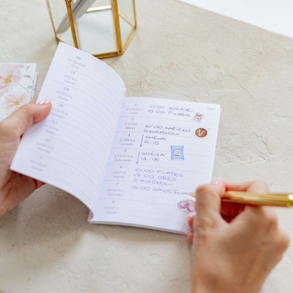 Přehledné týdenní rozložení na každé straně (na dvojstranně dva týdny), které vám umožní mít celý týden přehledně na očích – včetně schůzek, úkolů a plánů.