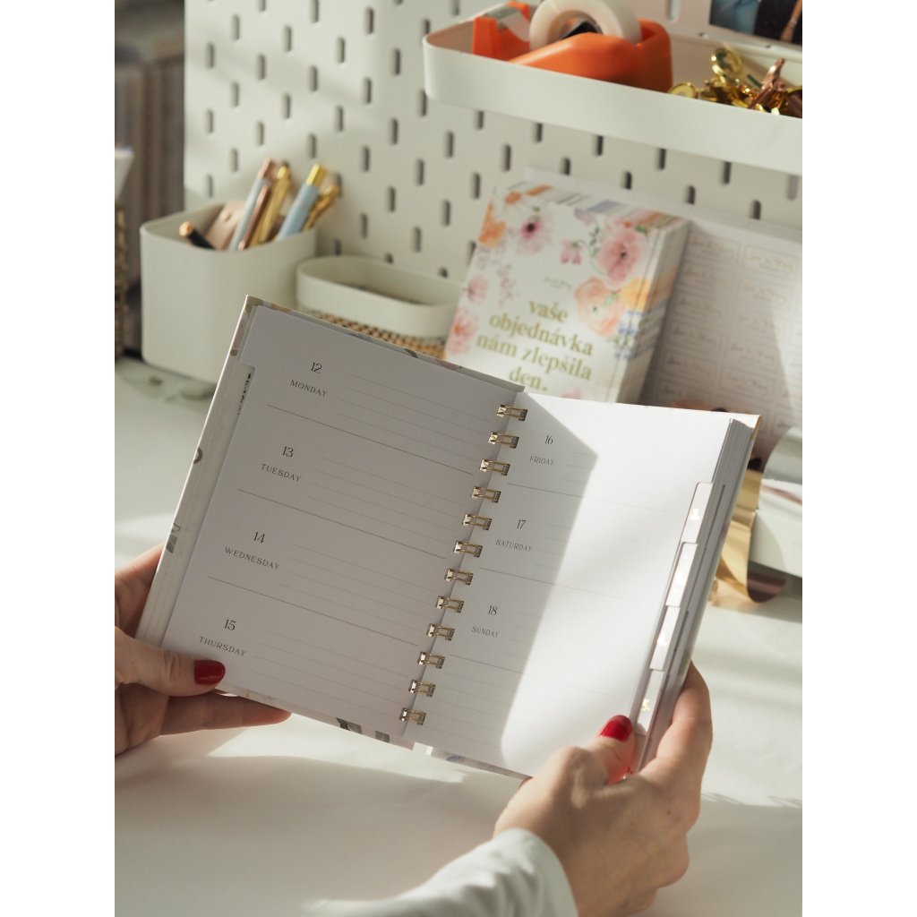 Kroužkový diář velikosti A6. Diář je v angličtině.
