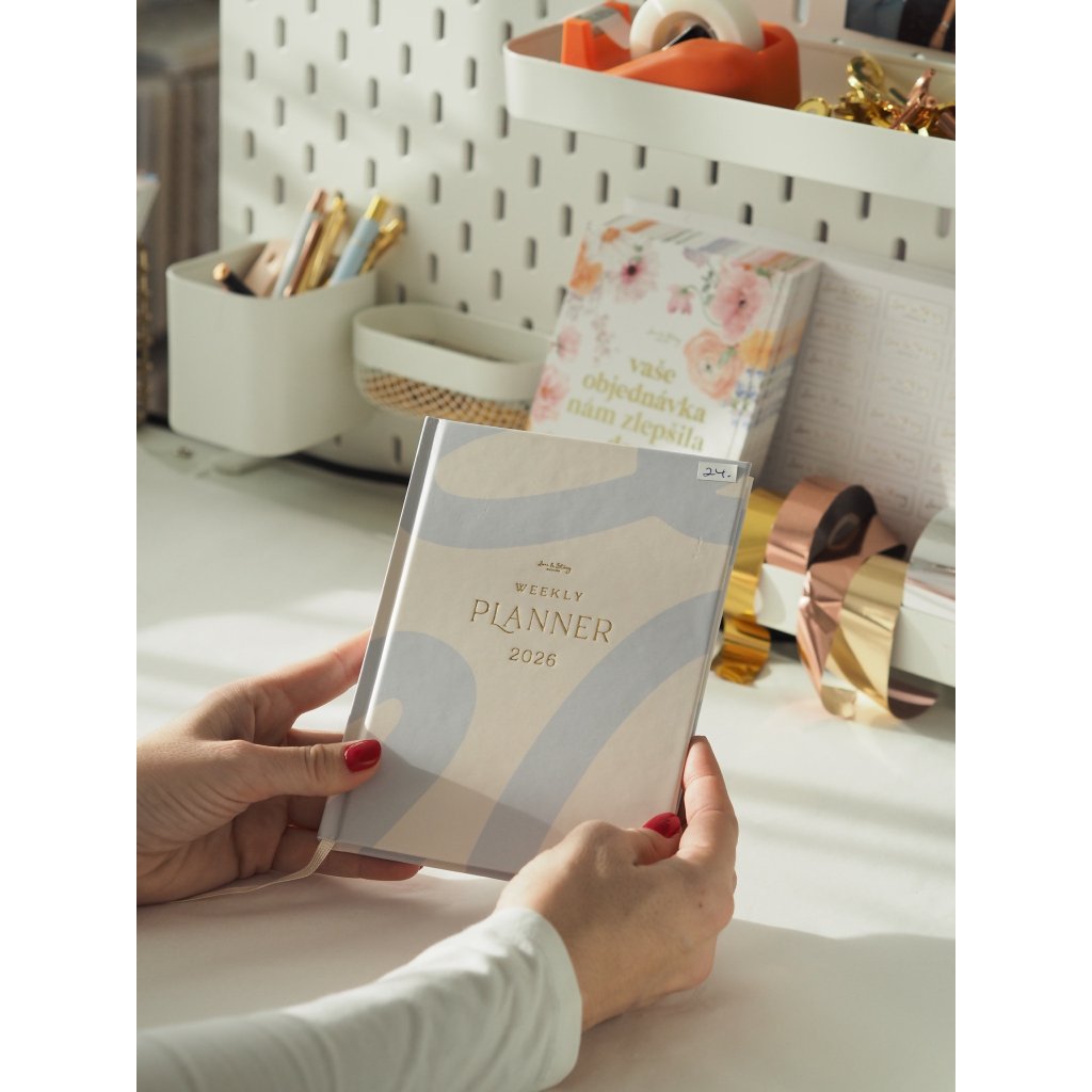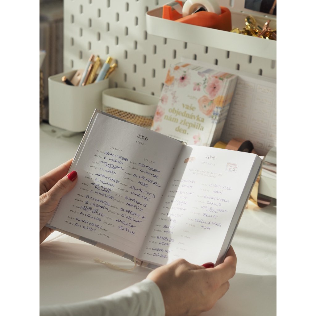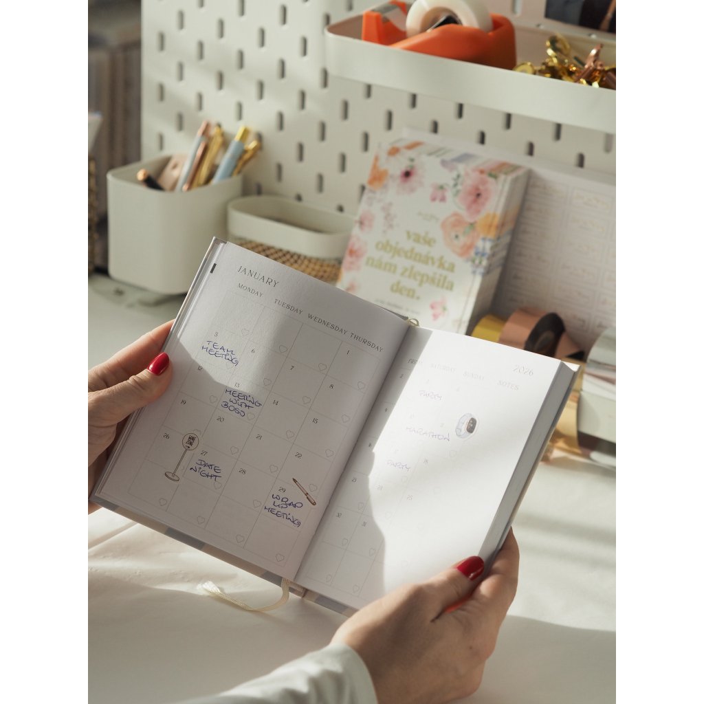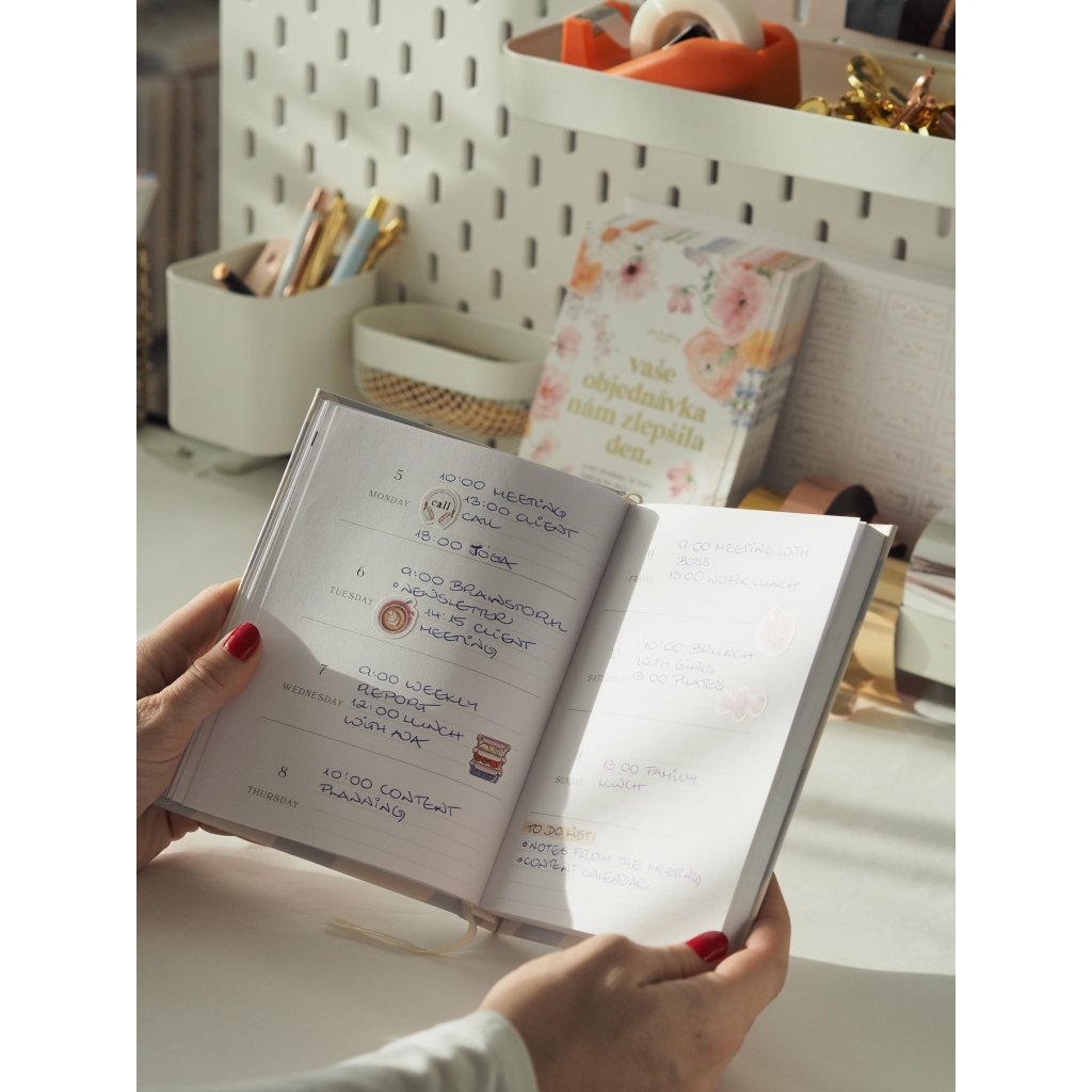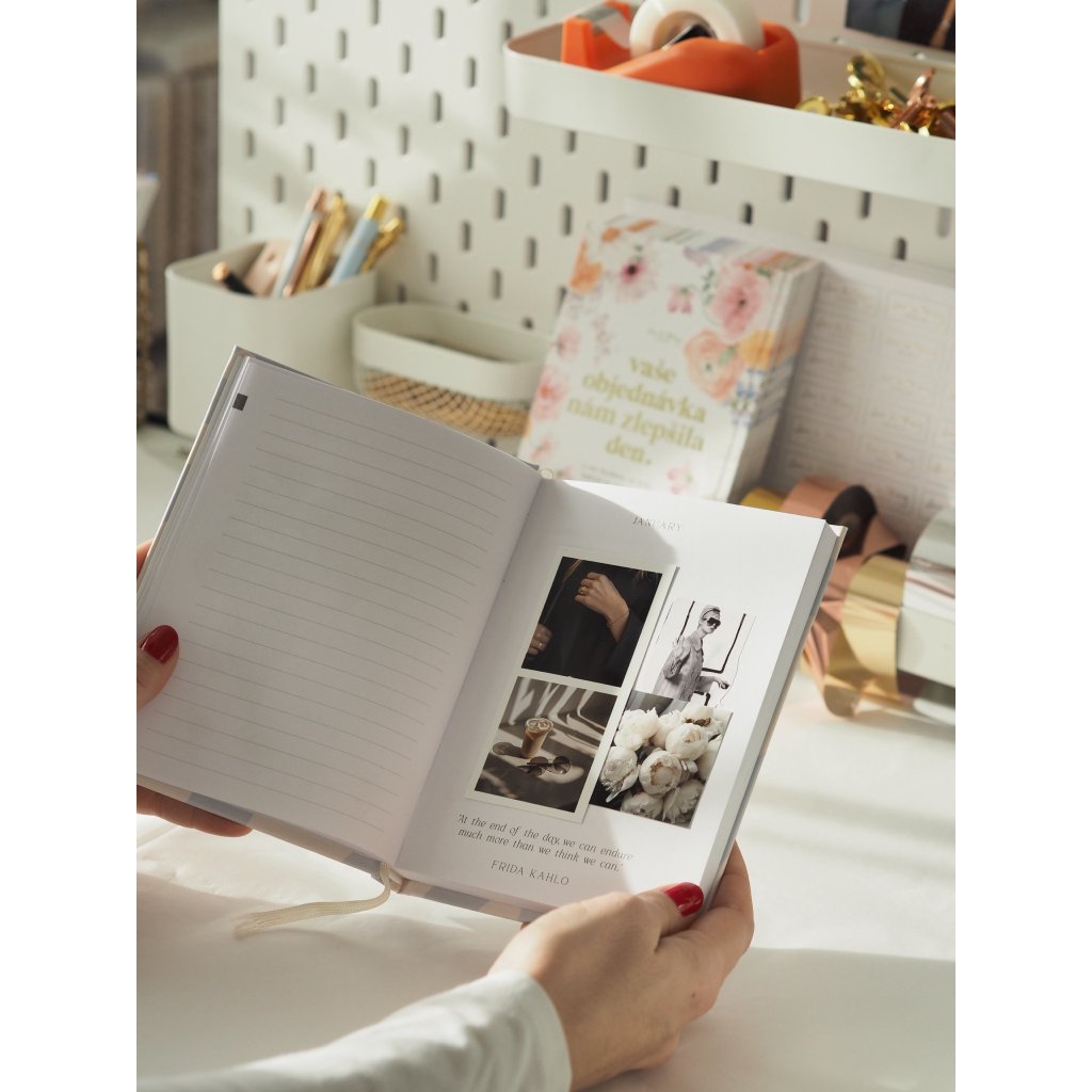 Knižní diář velikost A6. Diář je v angličtině. Diář byl použit na focení. Nemá výseky na měsíce a má předvyplněný moodboard na začátku měsíce ledna, lednový měsíční přehled a týden od 5. do 11. ledna.