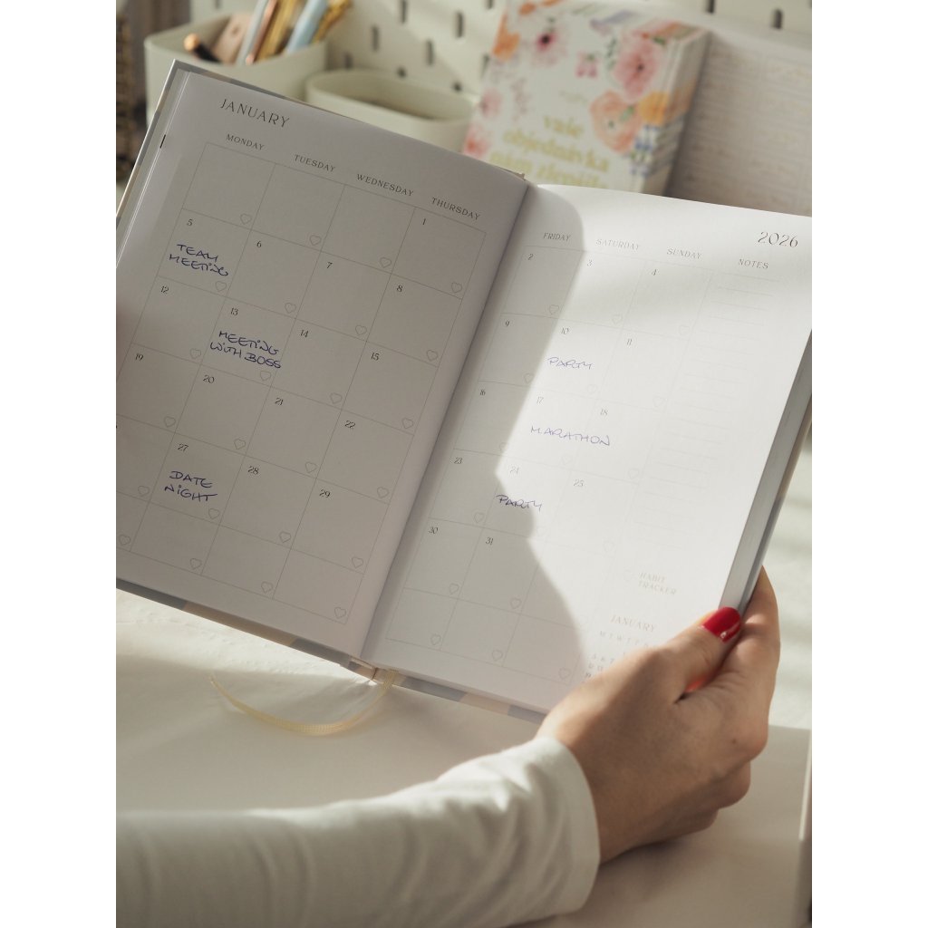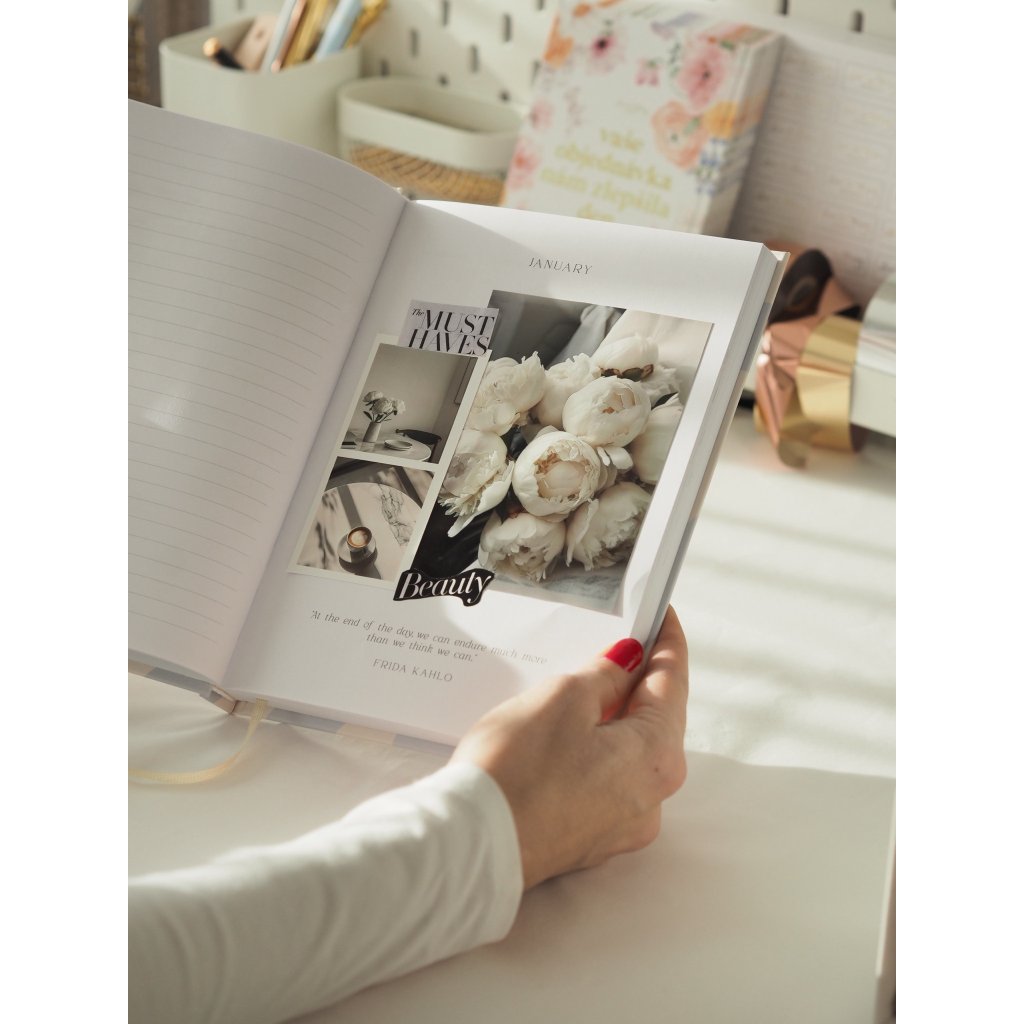 Knižní diář velikosti A5. Diář nemá výseky na měsíce. Diář má rose gold detaily. Finální verzi jsme dělali se zlatými detaily. Byl využit na focení. Nemá výseky na měsíce a má předvyplněný moodboard na začátku měsíce ledna, lednový měsíční přehled a týden od 5. do 11. ledna. Diář je v angličtině.