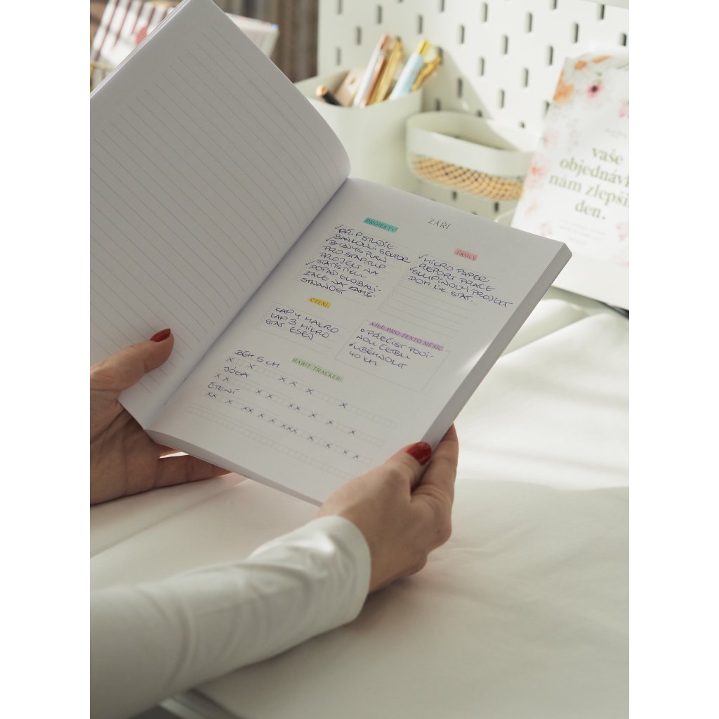 Akademický diář na rok 2025/2026. Diář byl použit na focení a má vyplněnou úvodní stranu v září 2025 a první týden v září 2025. Diář má na sobě zlatou ražbu LM.