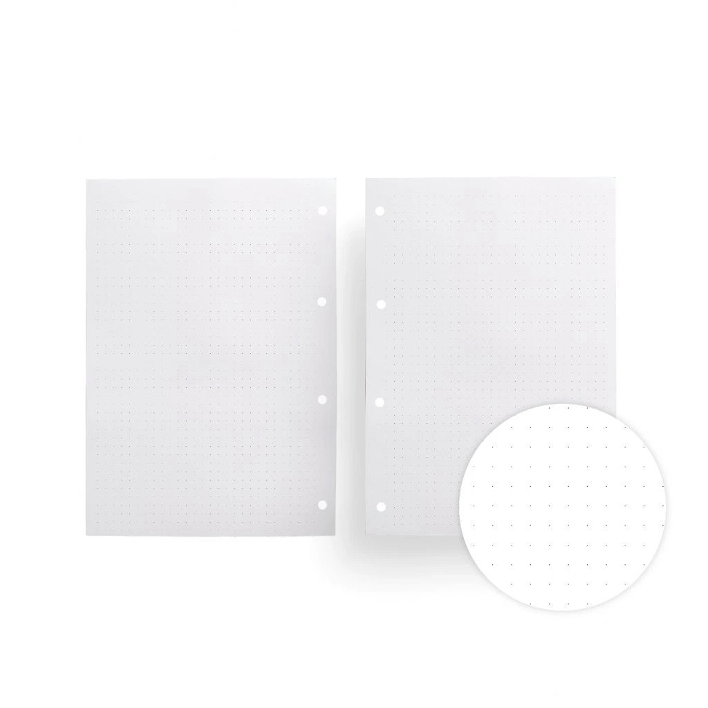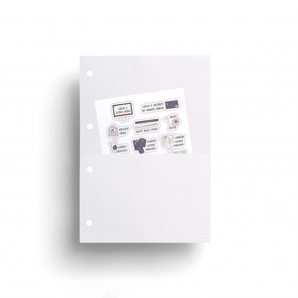 Šanon velikosti A5 obsahuje 120 stran tečkovaných listů a dvě vkládací kapsy (jedna se dá použát na začátek a druhá na konec). Šanon má bílou gumičku.